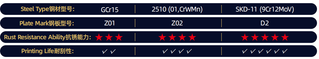 WINNEO ADVICE: The common steel (such as the GCr15 or 2510# steel material) cliché plates can be reground and reuse 2 or 3 times, and the Chrome steel cliché plates (such as the D2), you can reuse 5 times or more.