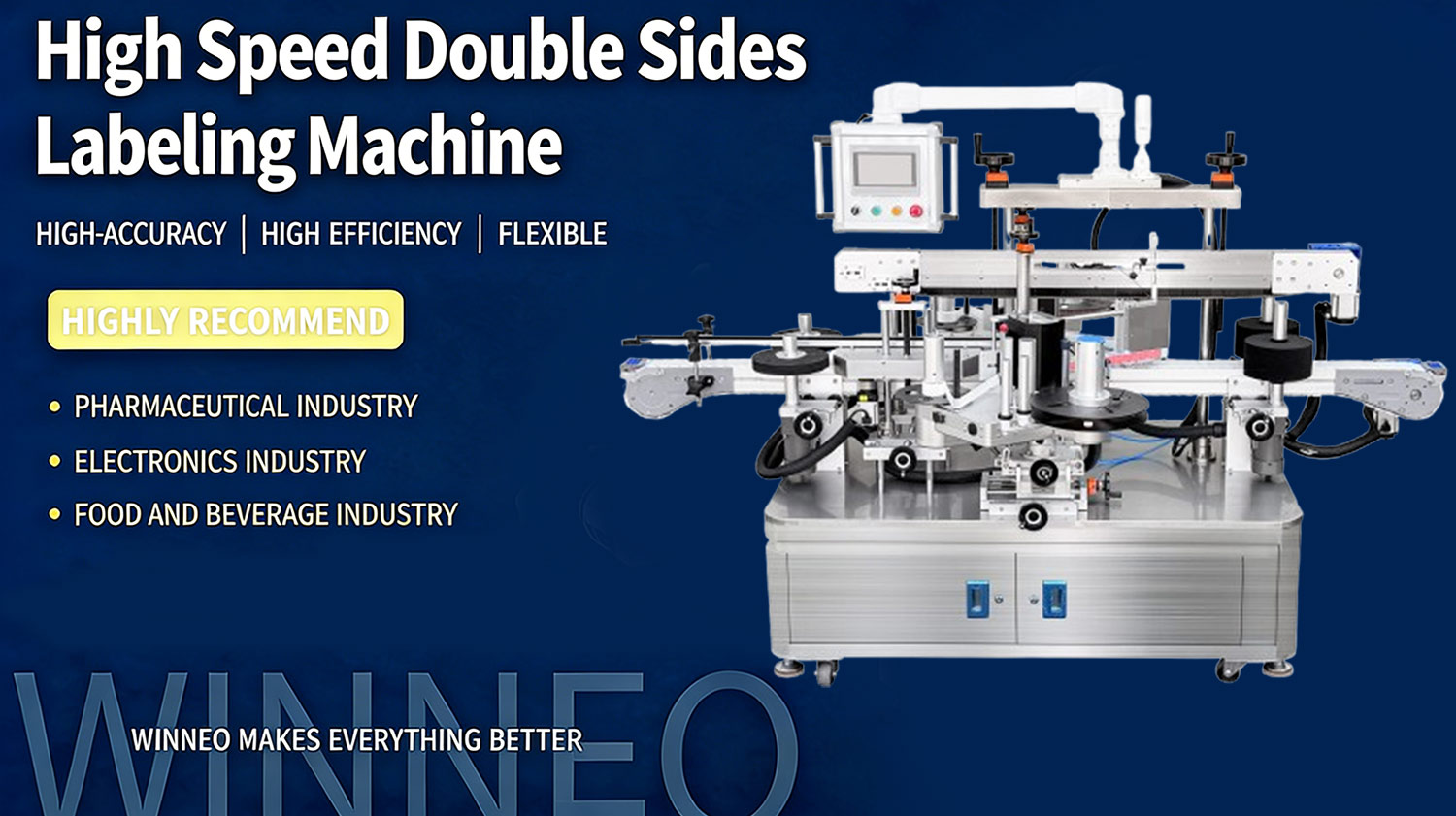 High-speed double-sided labeling machines are mainly suitable for industries including daily chemicals, food & beverage, pharmaceuticals & healthcare, and chemicals & lubricants.